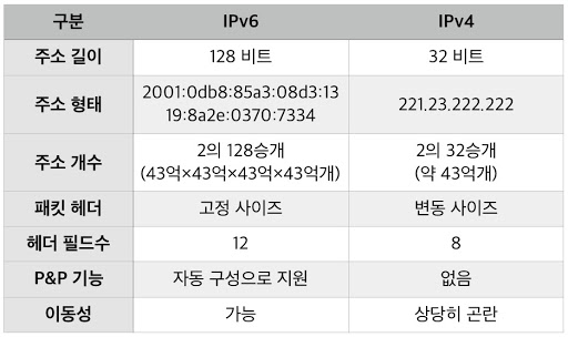 IPv4는 길이가 32비트라서 주소를 약 43억 개 만들 수 있는데 처음 IP주소를 만들 때는 43억 개면 충분하다고 생각했지만 인터넷이 널리 보급되면서 IP주소가 부족해졌고 그러면서 IPv6주소를 사용하게 되었다. IPv6은 길이가 더 길어서 더 많은 주소를 만들 수 있다.(사실상 무한대..)