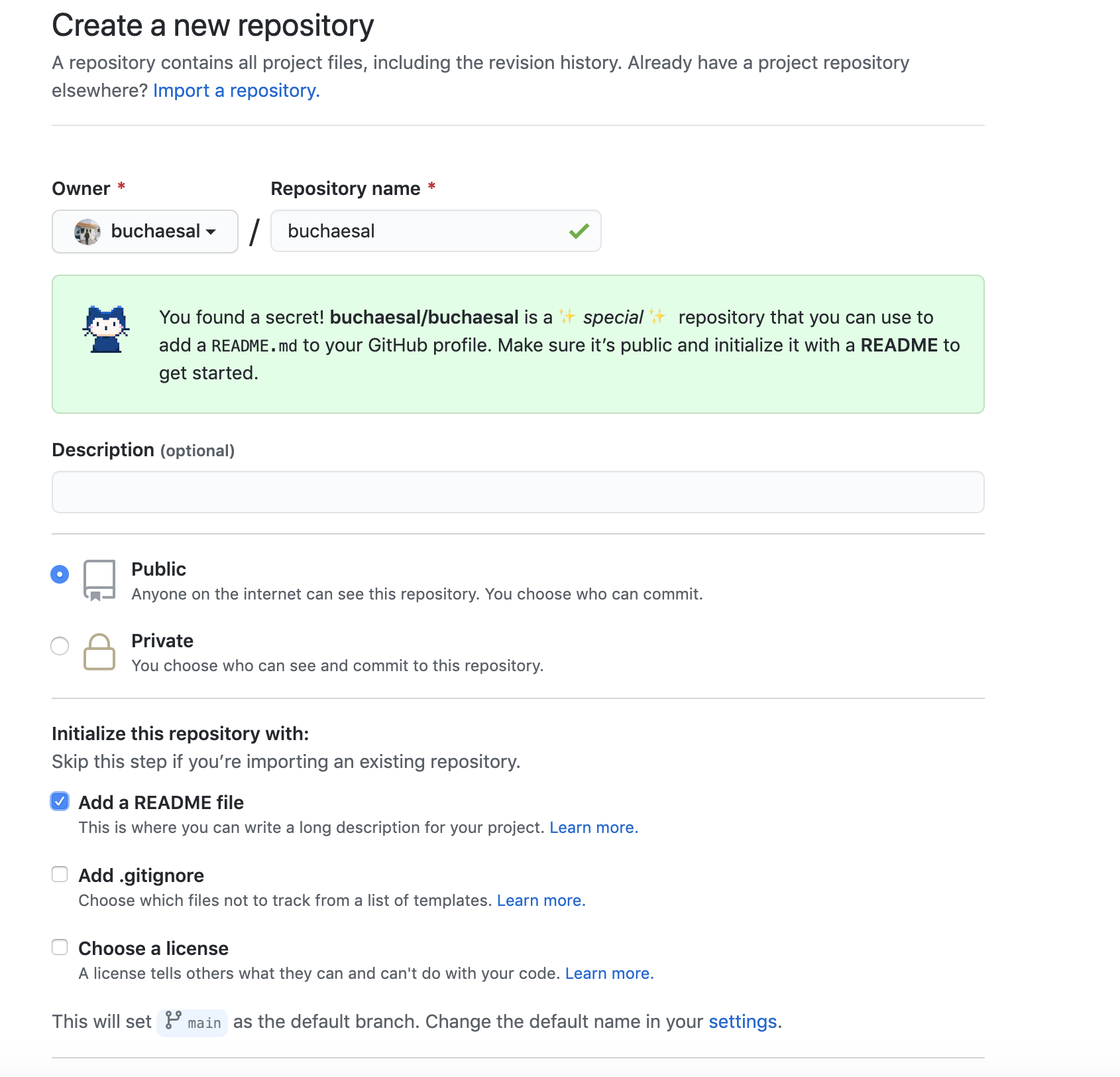 이름을 내 username과 같은 이름을 쓰면 이런 깜찍한 README.md 추가에 대한 설명이 뜹니다.