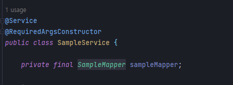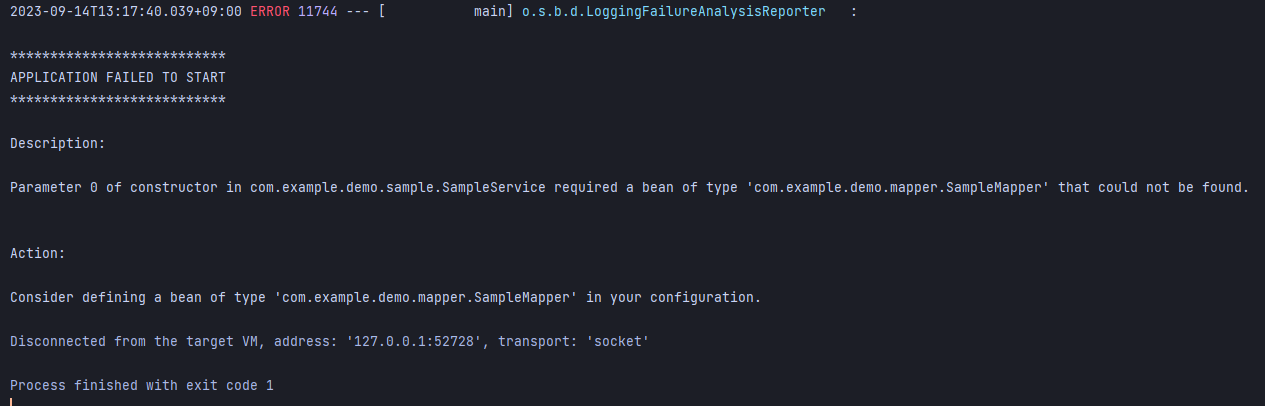 에러는 말 그대로 SampleService에서 SampleMapper를 DI 하려고 했는데 sampleMapper라는 bean이 없다는 뜻.