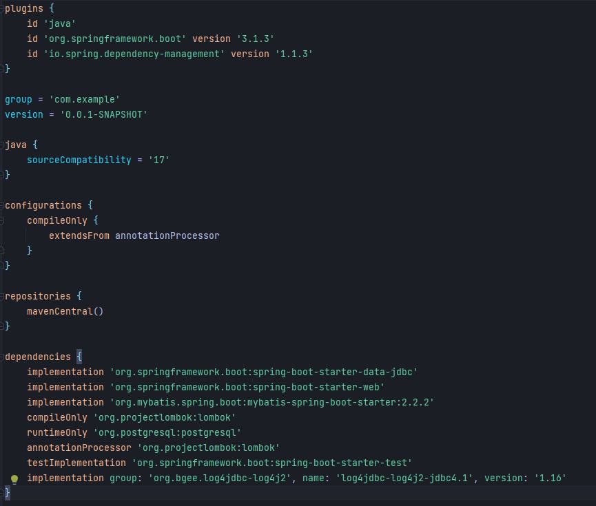 자바17에 스프링부트는 3.1.3 버전이었고 dependency들은 예전 프로젝트 환경설정들을 가져왔다.