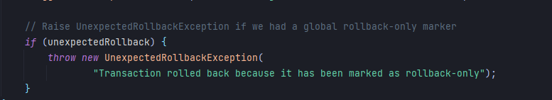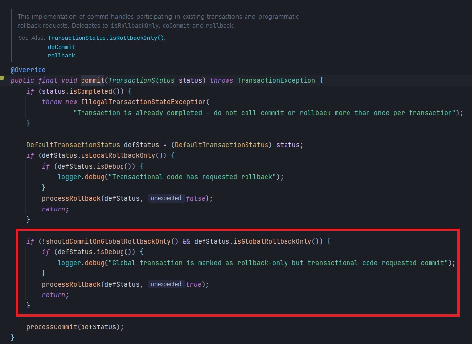 아무튼 어떤 제어도 없기에 여기에서 이 값은 default인 false에 부정연산자가 적용되어 true, 그리고 isGlobalRollbackOnly는 아까 exception으로 인해 connection에 rollback-only가 되어있으니 true가 되어 true && true니까 안의 로직을 타게 된다.