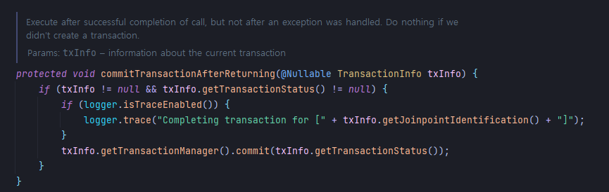 - 에러 발생 없이 끝까지 흘러서 commitTransactionAfterReturning 호출