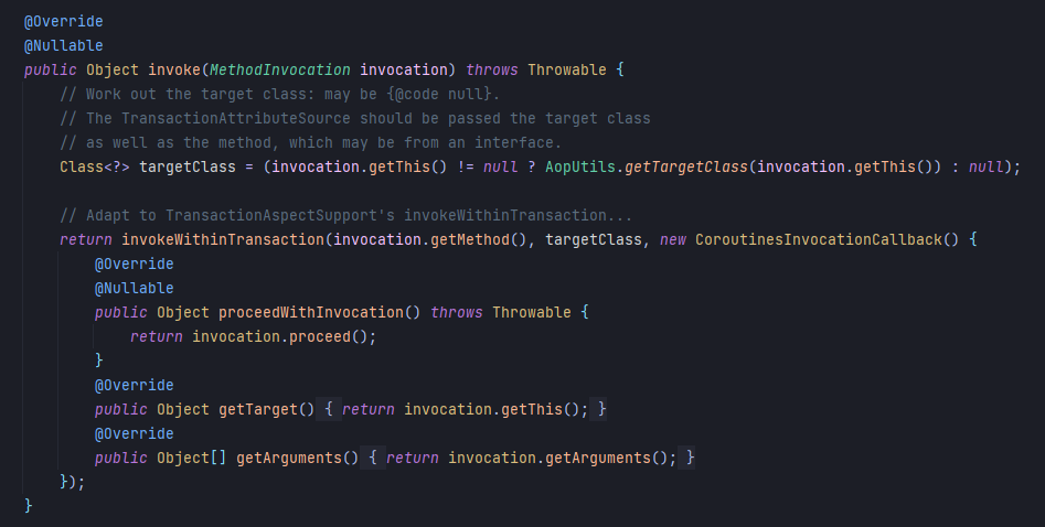 return문에 있는 것처럼 TransactionAspectSupport.invokeWithinTransaction가 호출된다.